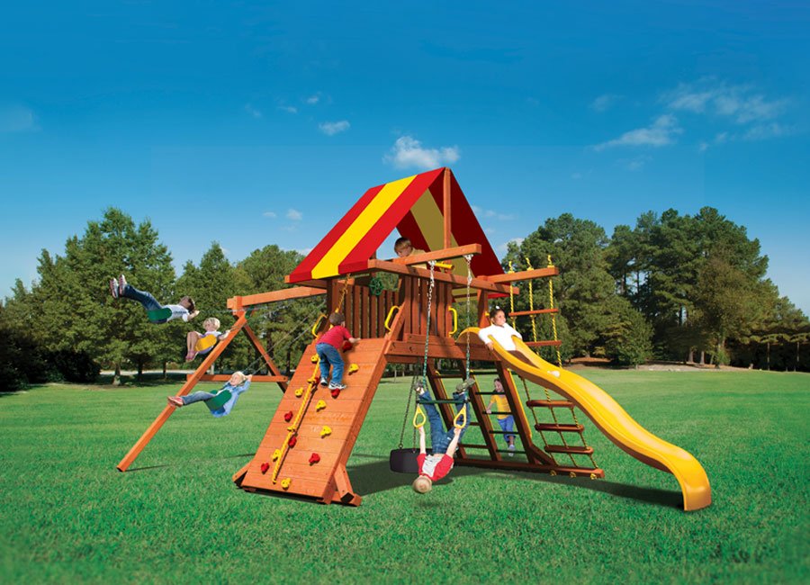 They’ll rule the jungle – a.k.a. the backyard! Our five-foot angled-base playset is full of fun features and far-out adventures. Customize with monkey bars or a wood roof.