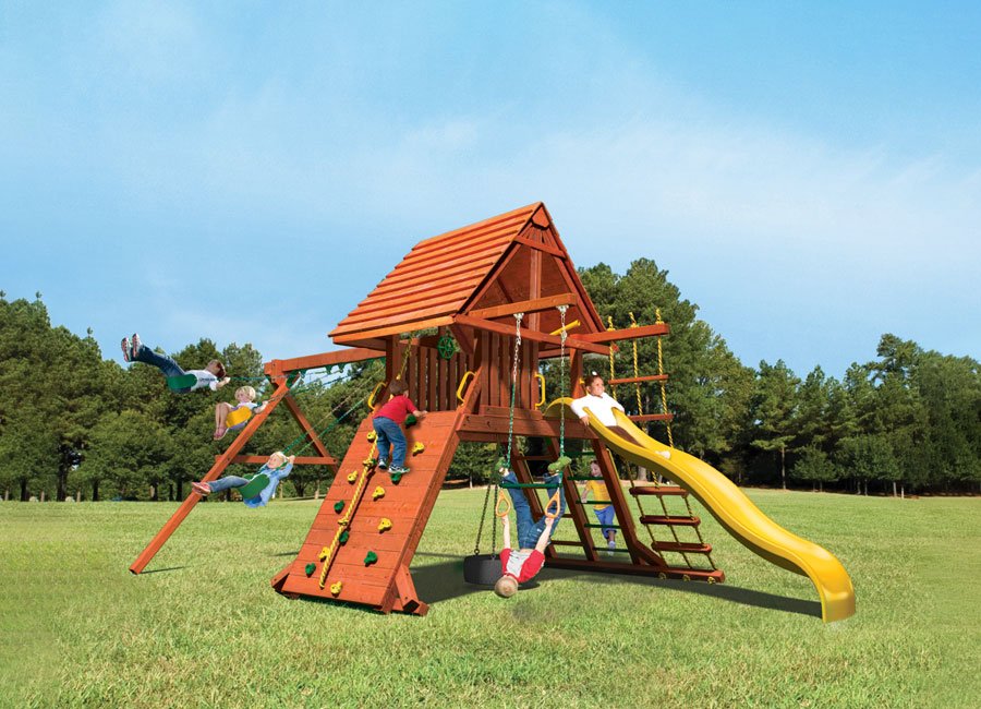 They’ll rule the jungle – a.k.a. the backyard! Our five-foot angled-base playset is full of fun features and far-out adventures. Customize with monkey bars or a wood roof.