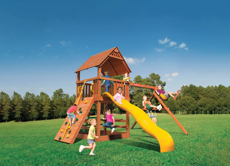 The playset shown above is a combo 2 and includes a slide for an exciting and safe high-speed rush as well as a swing beam to get your kids flying high outside, in your own backyard! A wood roof adds a gorgeous architectural element to your backyard, it features stylish gables and is finished to match both redwood and cedar finishes! *Prices may vary on our installation images due to customization.