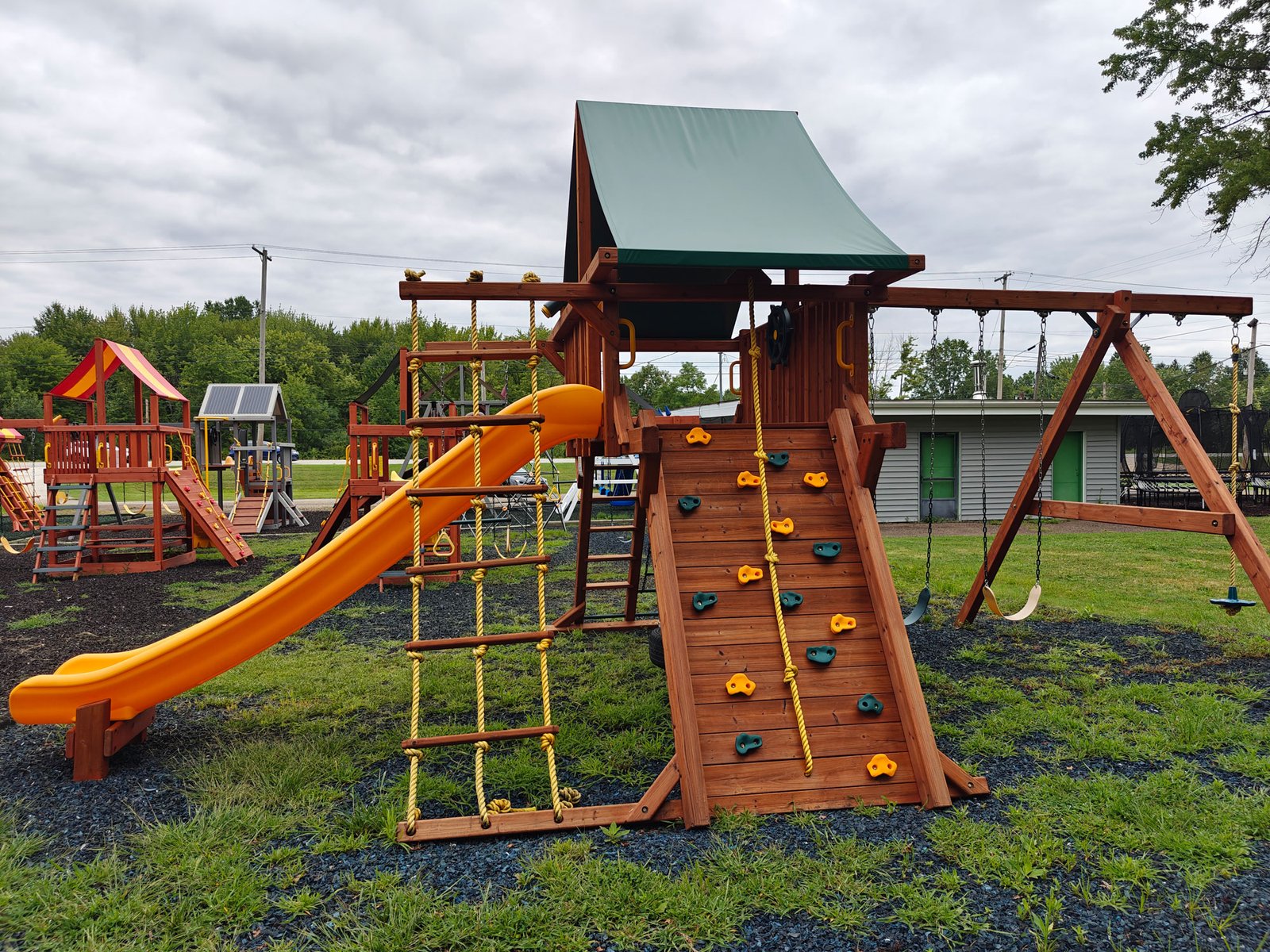 Save $2,400 on this (2023) Outback 6 XL Combo 2 (Pg. 24) Woodplay playset with green vinyl canopy, green/yellow rocks, and yellow slide. Sale price includes installation and delivery within our service territory. Limited supplies! Located in Medina, OH.
