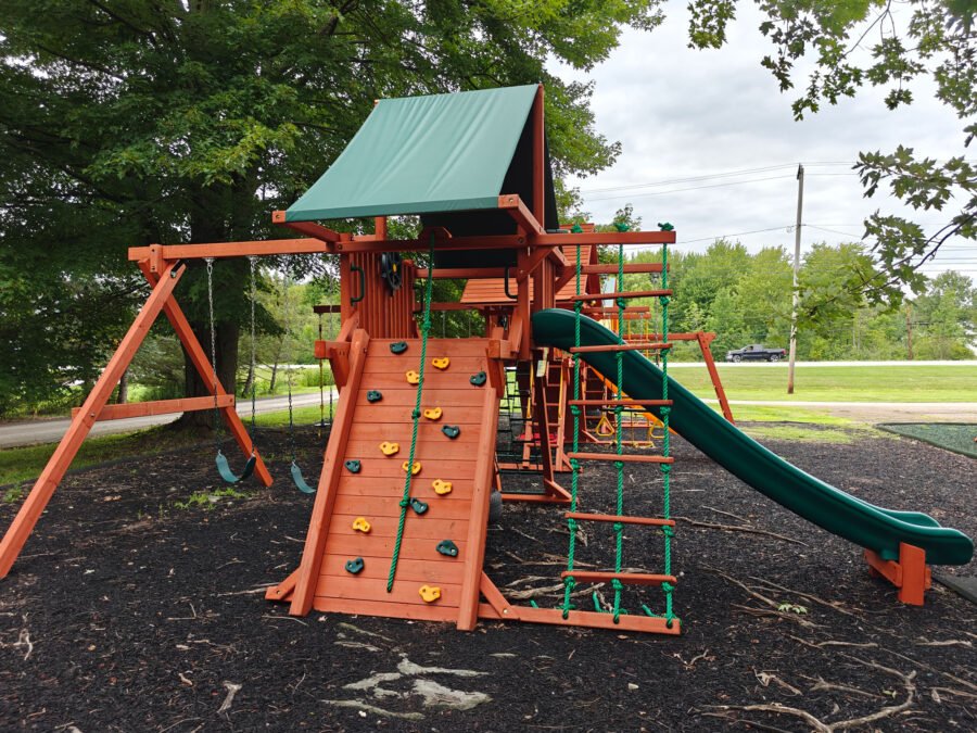 Save $1,549 on this Outback 6 Combo 2 (Pg. 19) Woodplay playset with green vinyl canopy, green/yellow rocks, green slide, green ropes, green swings, and a 2 position swing beam. Sale price includes installation and delivery within our service territory. Limited supplies! Located in Medina, OH.