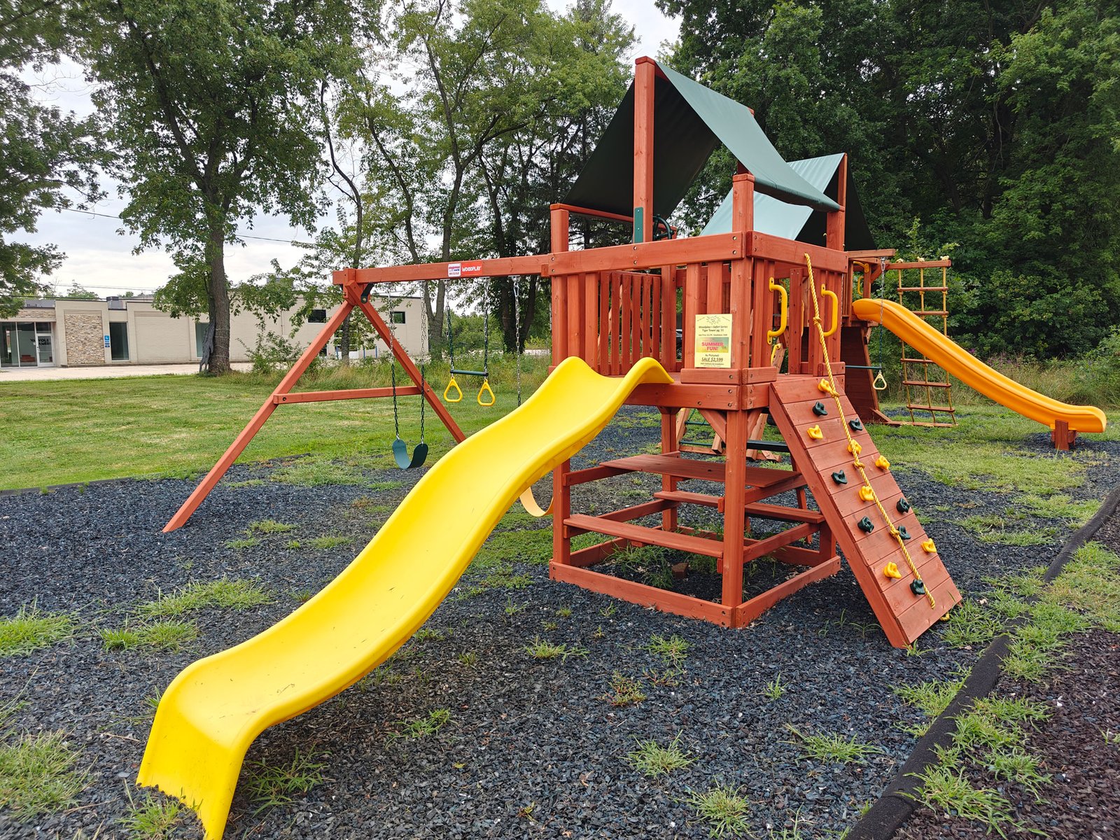 Save $1,000 on this Tiger Tower (Pg.55) Woodplay playset with green vinyl canopy, green/yellow rocks, and yellow slide. Sale price includes installation and delivery within our service territory. Limited supplies! Located in Medina, OH.