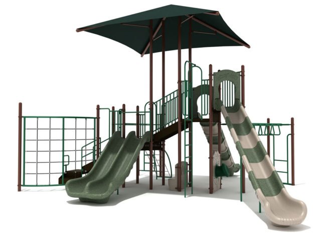 Climbing Features Vertical ladder, overhead trapezoid ladder, curved chain climber, curved net climber