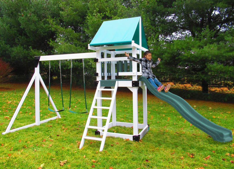The Weaver Vinyl Happy Time Playset is all about big fun in a compact design. Measuring 15′ x 29′, it features durable, low-maintenance vinyl construction and includes classic play elements like swings, a slide, and climbing features—perfect for hours of safe, backyard adventure.