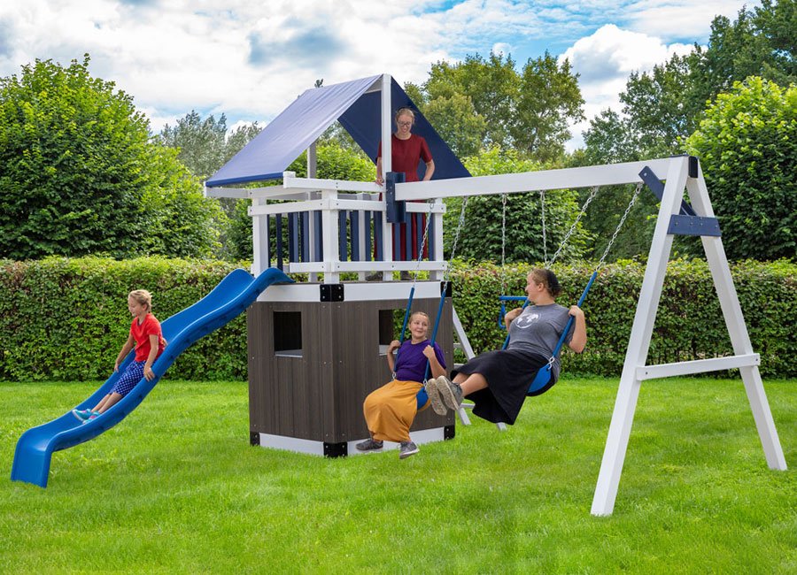The Weaver Vinyl Clubhouse Delight Playset delivers classic backyard fun in a space-saving 20′ x 22′ design. Built from durable, low-maintenance vinyl, it features a charming clubhouse, swings, slide, and climbing elements—perfect for imaginative play and active outdoor adventures.