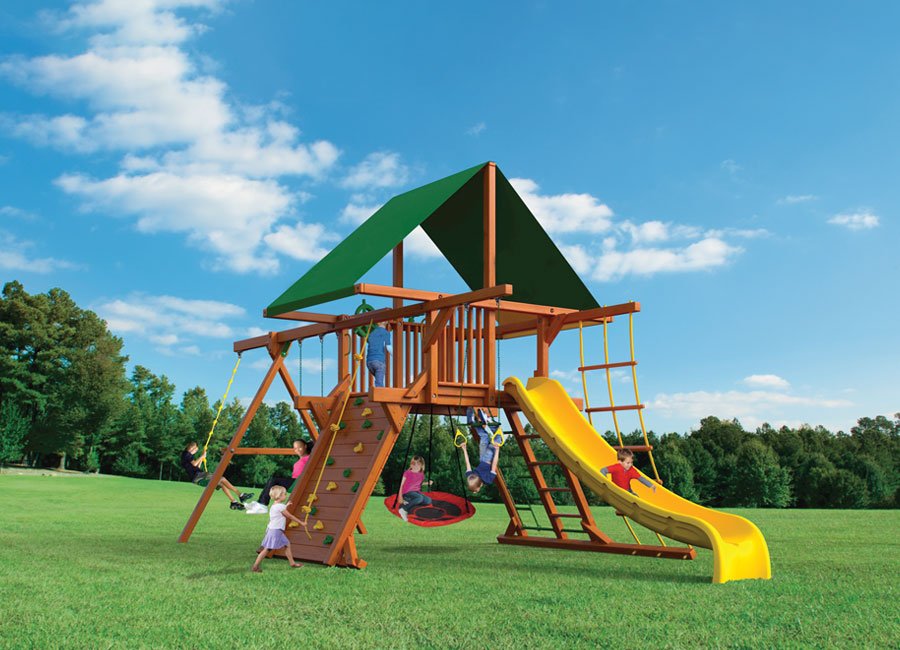 The Outback™ Series playset will get your kids outdoors and it will look great in your backyard! The Outback features angled ladders which are a Woodplay® original – and now an industry standard. The angled base design offers more play area, greater stability and a sturdy foundation, making this Outback model great for uneven or sloping yards, large families or kids with lots of friends. The Outback playset creates the most room “down under” the deck – enough room for a tire swing – and gives wide access to the deck from the rock wall or rope ladder! With room for several swings, three climbing add-ons, and two on-deck accessories, this wood swing set has a bit of everything to keep kids playing happily for hours.
