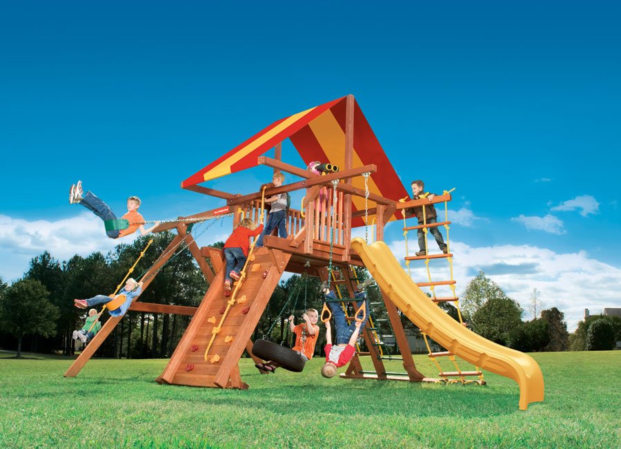 The Outback™ Series playset will get your kids outdoors and it will look great in your backyard! The Outback features angled ladders which are a Woodplay® original – and now an industry standard. The angled base design offers more play area, greater stability and a sturdy foundation, making this Outback model great for uneven or sloping yards, large families or kids with lots of friends. The Outback playset creates the most room “down under” the deck – enough room for a tire swing – and gives wide access to the deck from the rock wall or chain ladder! With room for several swings, three climbing add-ons, and two on-deck accessories, this wood swing set has a bit of everything to keep kids playing happily for hours.