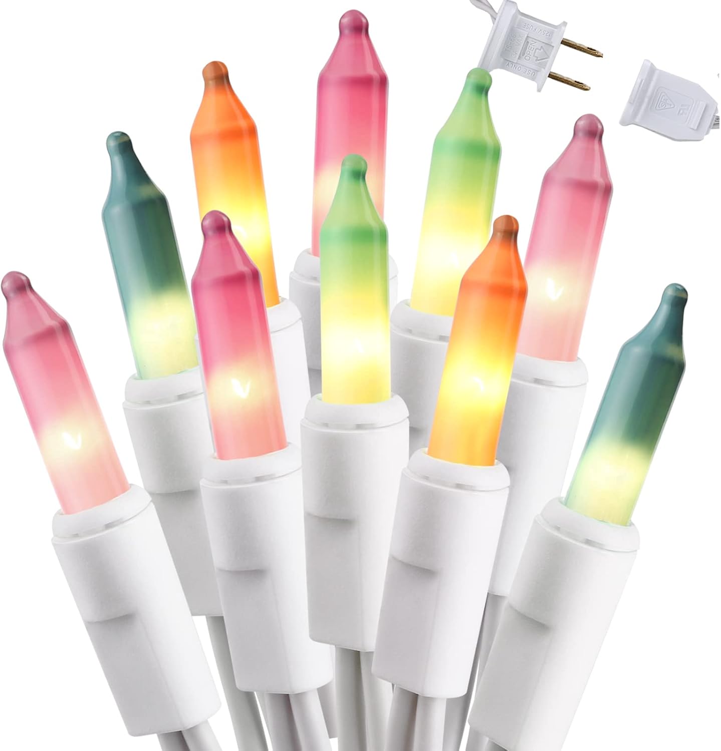 Brizled 300 Counts Connectable Blue Christmas Mini Lights Features: 300-ct blue incandescent string lights, non-LED. Feature end to end connector, which can connect up to 3 sets (450 lights). White cord combines with blue lights to suit Christmas, a special party or daily bedroom and any other festival atmosphere. For both indoor and outdoor use. UL certified, safe to use. Extra bulbs and fuses included. Specifications: Light Color: Blue Bulb Type: Incandescent Bulbs Wire Color: White Wire Bulb Quantity: 2*150 count Voltage: 120V Bulb Space: 0.21ft Total Length: 69.6ft(34.8ft per string) Lead Length: 0.21ft Waterproof Class: IP44 Package Included: 2 x 150 Count Blue Christmas Lights 4 x Extra Bulbs 4 x Extra Fuses